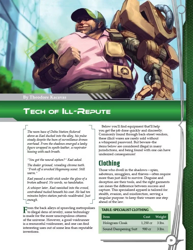 From the back alleys of sprawling metropolises to illegal dens of revelry, some technology is made for the more unscrupulous citizens of the universe. However, a good voidrunner is a resourceful voidrunner, and one can find interesting uses out of some less than reputable inventions. From credit skimmers to voice modulators, this street gear will help your voidrunner get by!