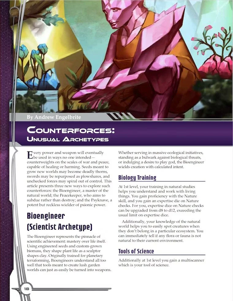 The Bioengineer holds a pinnacle of scientific progress, power over life itself. With designer seeds and biomass they can grow plant life like a sculptor shaping clay. The Peacekeeper wields force they pray they never have to use. Instead they use the authority of law and the threat of force to keep safety and order. The Psyknave received no training, no discipline to curb their emotions and shield the world from their raw psionic wrath. Most psyknights, even untrained ones, learn to eventually control their power and curtail their outbursts. The Psyknave instead embraces them, their mind and body are one, both acting on impulse as a truly dangerous and unpredictable force of chaos.