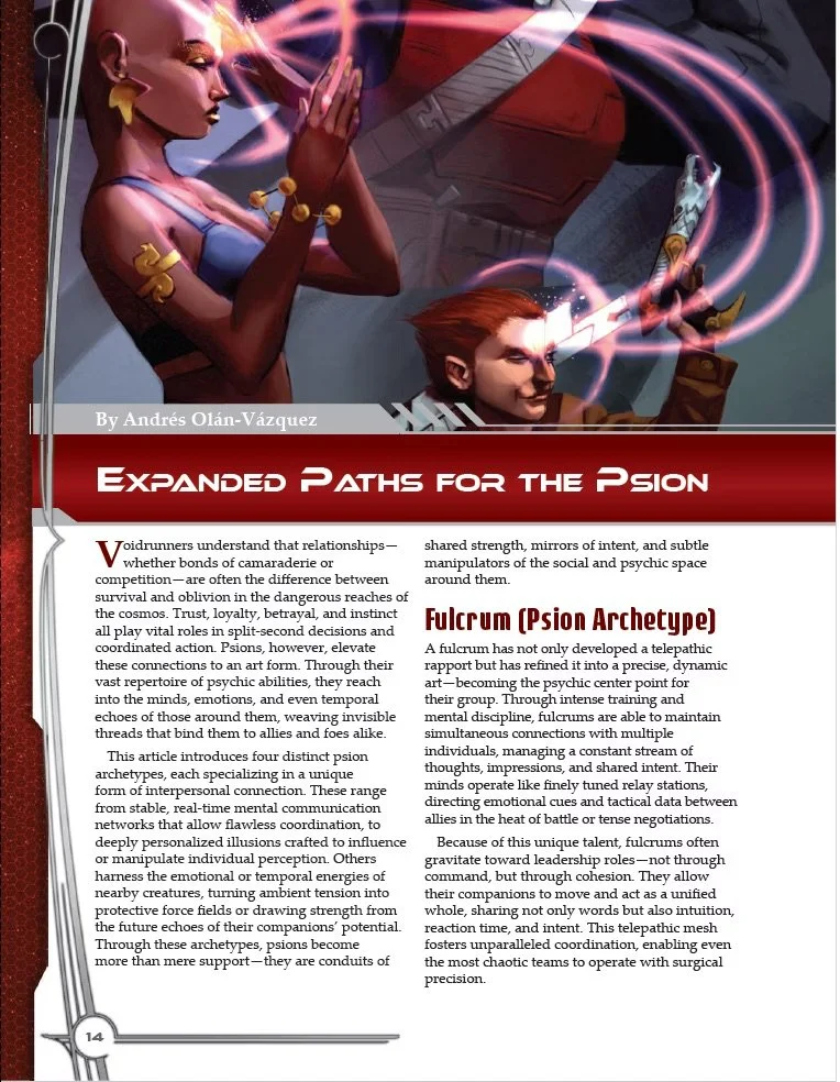 Discover new archetypes for the Psion! The Fulcrum telepathically connects their allies. The Mesmerist is able to alter the very way their targets perceive the world. The Timestealer masters temporal manipulation. And the Warder uses telekinesis to protect themselves and others.
