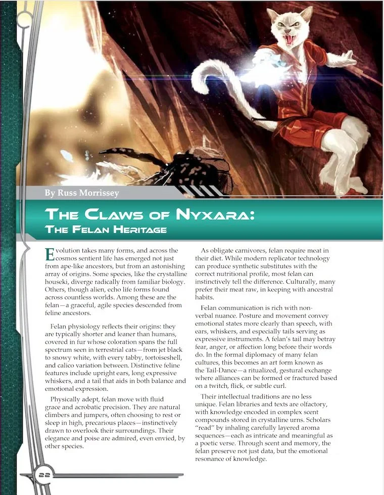 Felans, unimaginatively named by the first human explorers to encounter them, are a cat-like heritage. Like their four-legged namesake, Felans are often beautiful to the eye, and move with a graceful, acrobatic purpose. Easily able to jump and climb, Felans like to make use of their environment, and tend to sleep in precarious locations high above the ground. Felans have a deserved reputation for being easily distracted, and often flit from career to career, unable to settle.