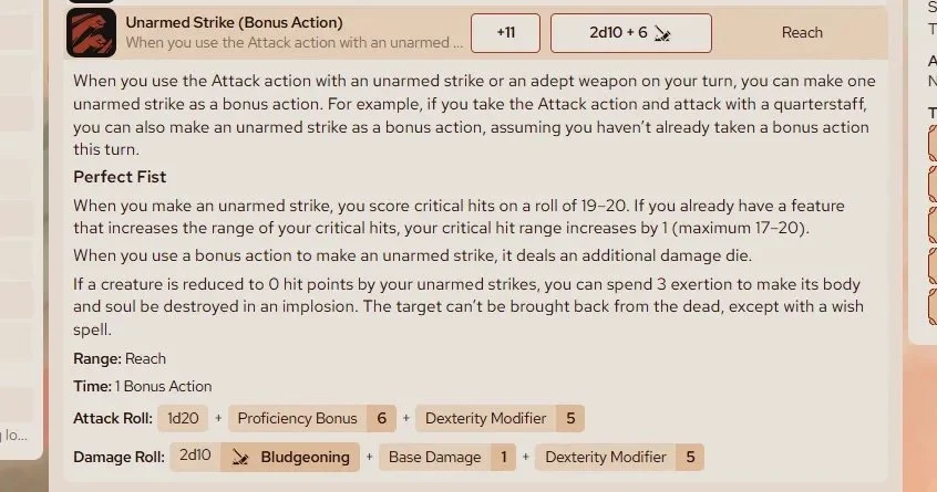 We added the Adept’s bonus action Unarmed Strike to the actions page, this was not explicitly show before since it is only available based on other actions on your turn but with the Perfect Fist feature changing its damage it is useful to have it present on the sheet to track it separately from the non bonus action version: