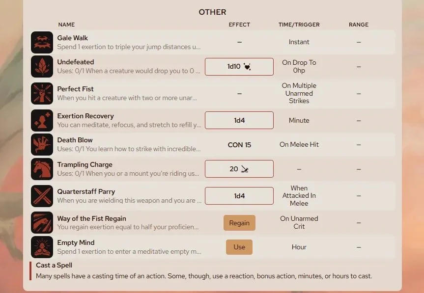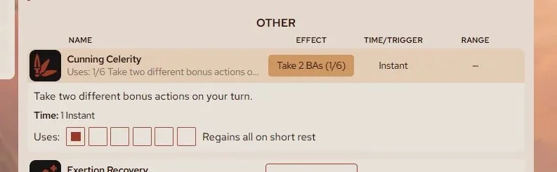 The Adept is now also supported to level 20 with 37 Focus Features and 15 Practiced Techniques. We’ve changed strategy with some Adept features, moving them from the Martial tab to Actions where we find they’re easier to keep track of. Longer term we will be moving more Focus Features and Practiced Techniques to appear in Actions as well as a way to manage Exertion.