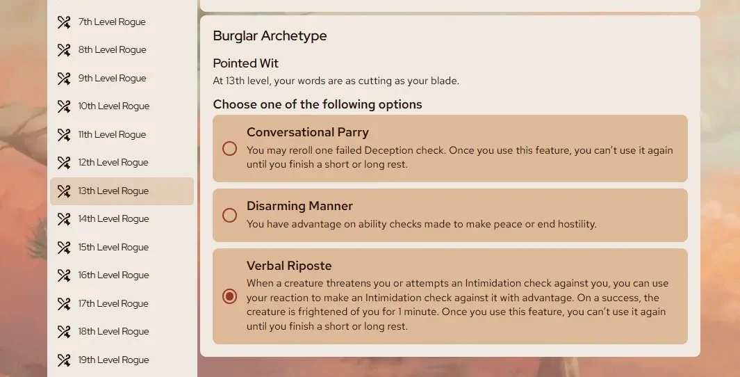 Rogues get upgrades to their skills, combat abilities and social tools. One particularly fun option is the Burglar Rogue’s Verbal Riposte which builds upon roguish stereotypes from fiction very well.